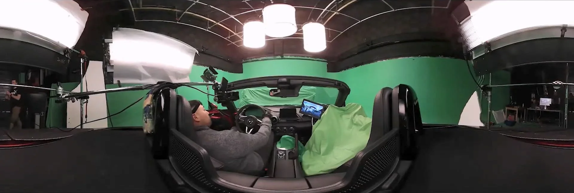 We developed a custom camera rig mounted directly to a Mazda MX-5, combining eight cameras including stabilised DSLRs with unique fisheye lenses, 360° cameras and compact action cams. Some cameras captured the driver’s movements for animation and performance matching, while others were stitched into a highly detailed panoramic 360° view of the driver’s perspective, capturing the authenticity and sense of place from each location.